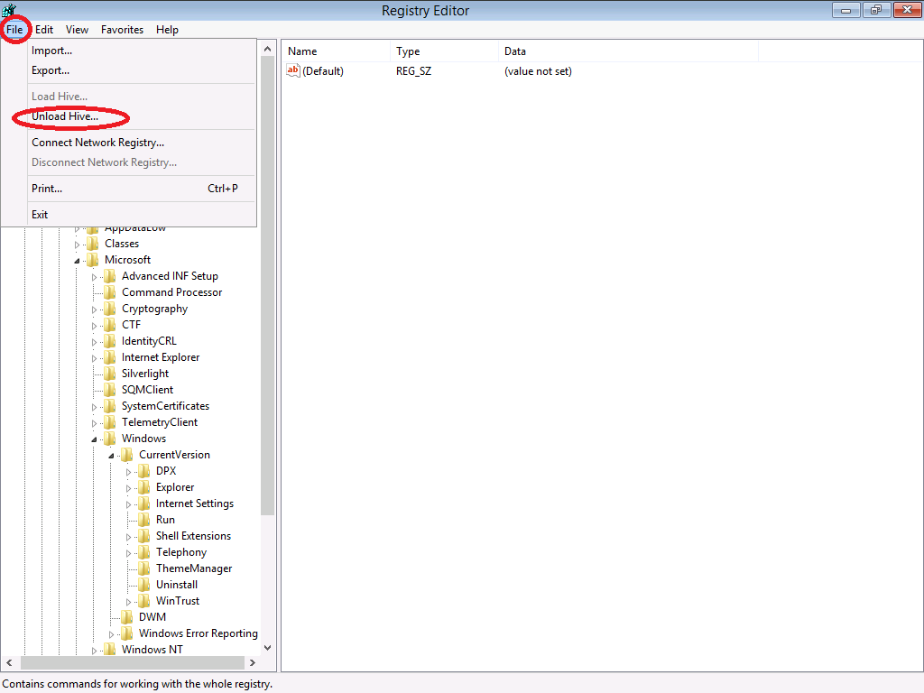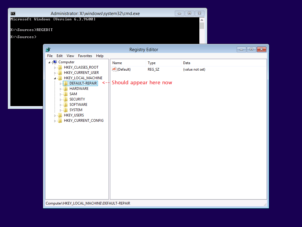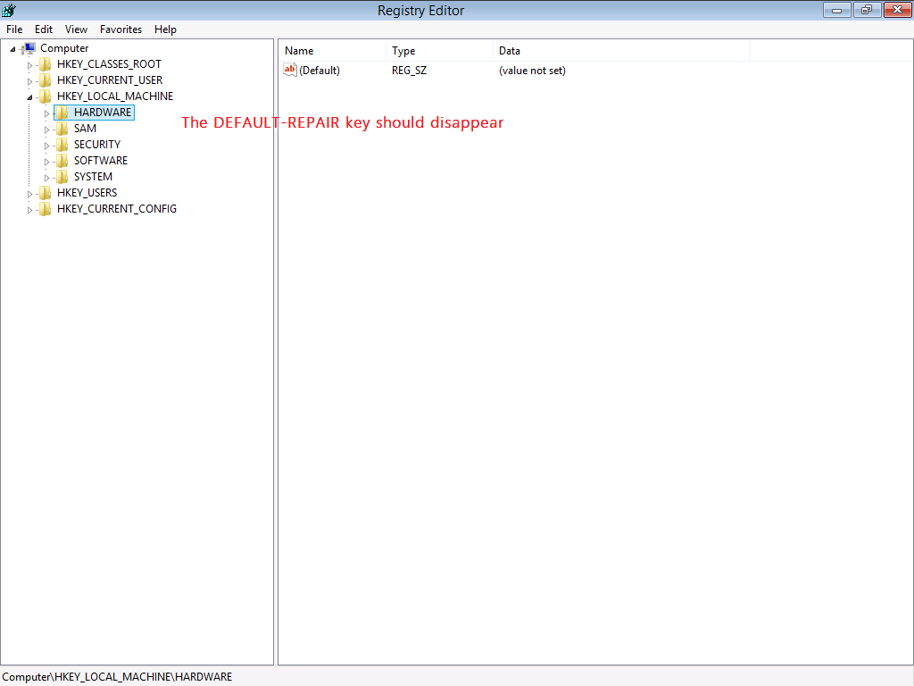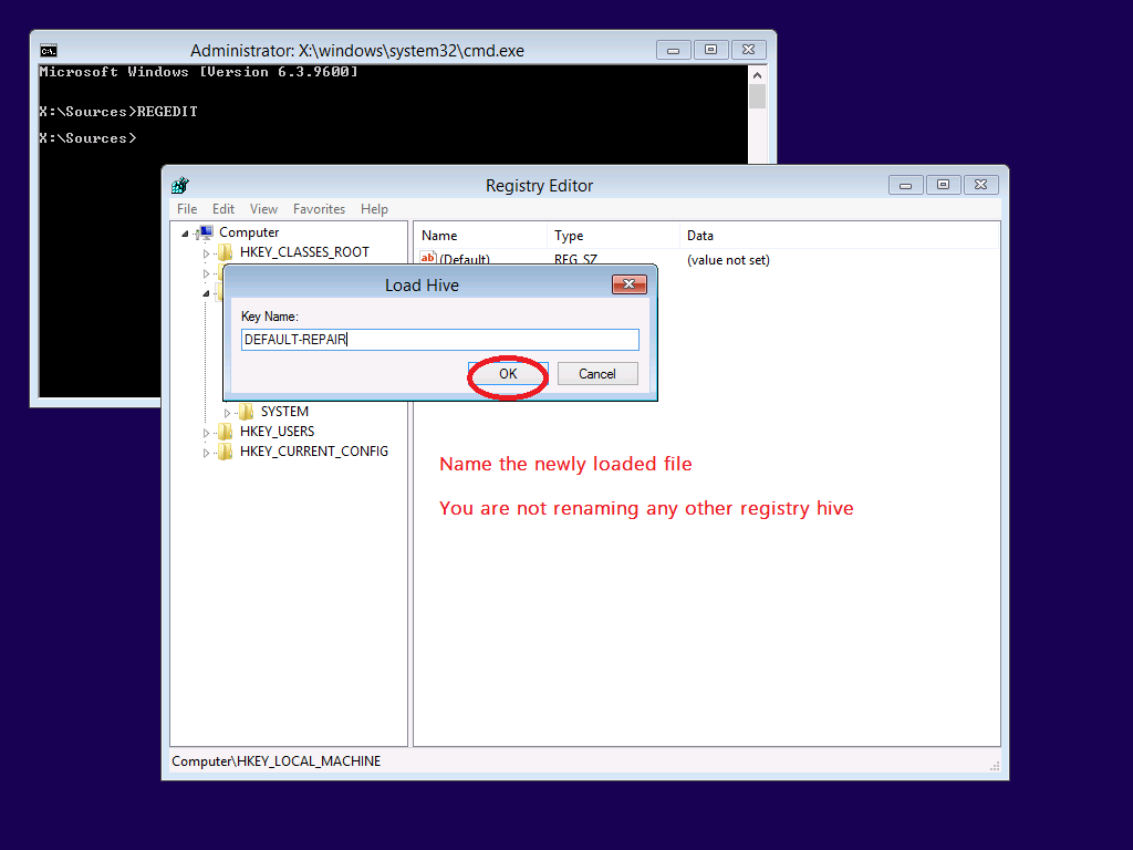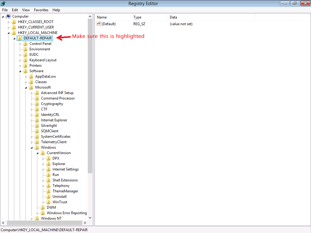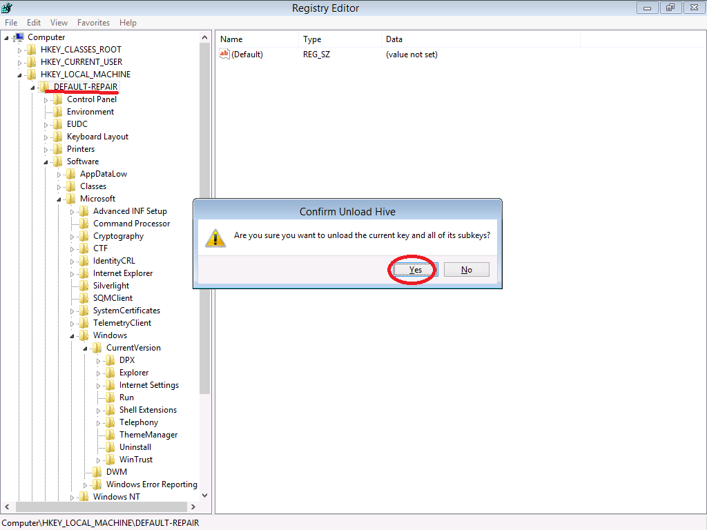 Step10: click okay on the dialog and return to the registry editor. Do not reboot yet, you need to unmount the registry hive. Scroll back up in the left pane and click DEFAULT-REPAIR.